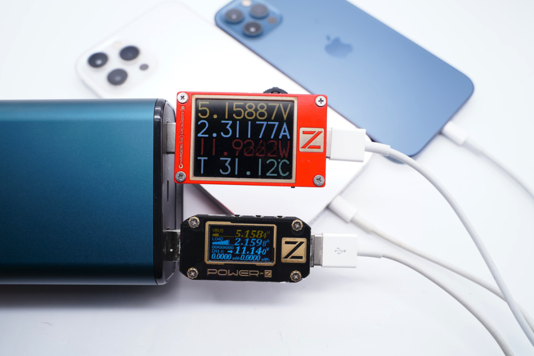多口输出这里,两个A口同时为苹果手机充电,双口功率均在12W左右。