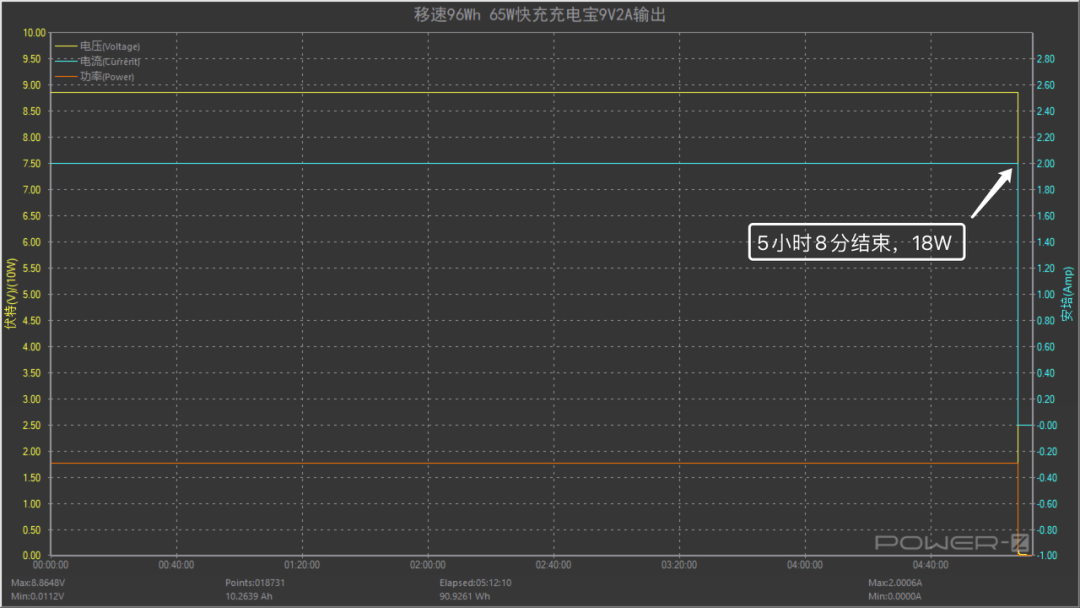 将功率提升至9V2A 18W,整个测试过程持续了5小时8分钟。放出的能量约为90.9261Wh,所以充电宝在以9V2A 18W功率持续输出时的效率约为90.9261/96=94.71%。