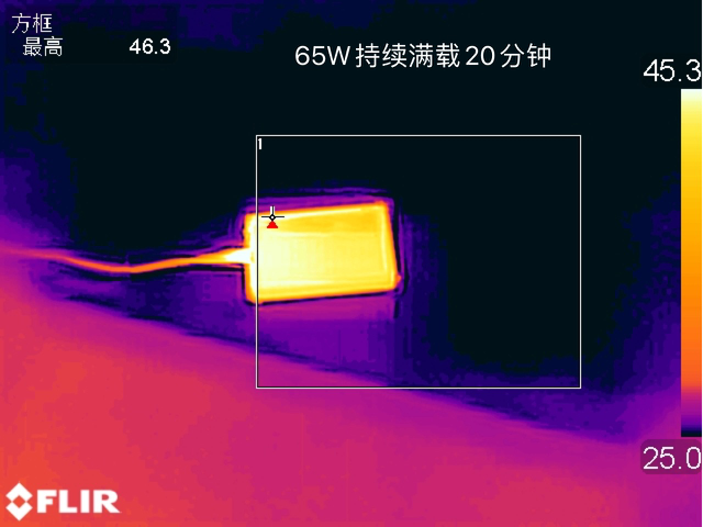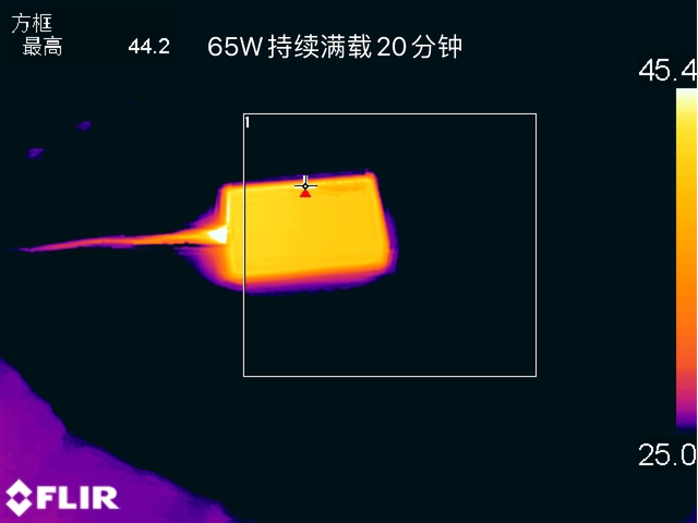 以65W的功率持续满载输出半小时后使用热成像仪采集充电宝表面的最高温度为40.4℃。