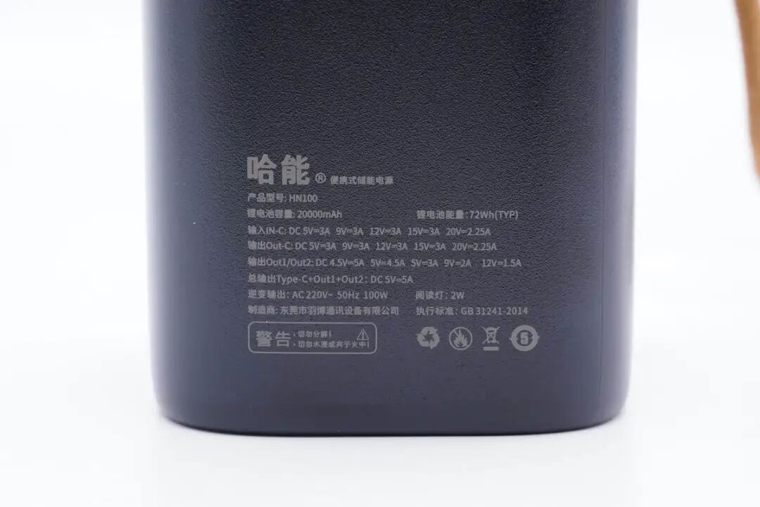 户外电源的型号为HN100,锂电池容量为20000mAh,锂电池能量为72Wh。制造商为东莞市羽博通讯设备有限公司。