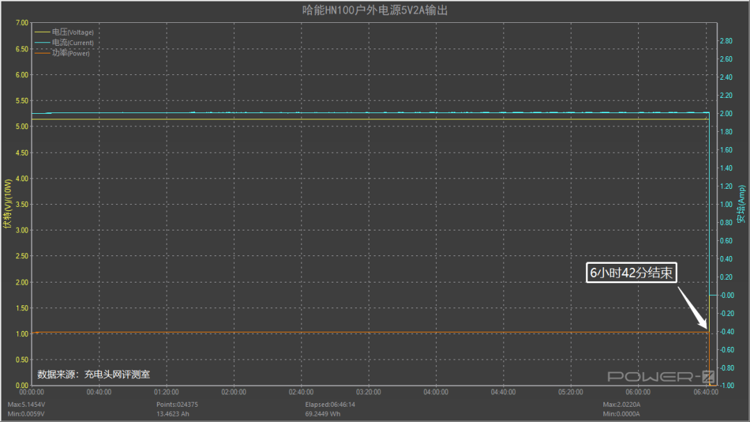 首先让哈能HN100户外电源以5V2A 10W的功率持续输出,整个测试于6小时42分结束。放出的能量约为69.2449Wh,所以户外电源在以5V2A输出时的效率约为69.2449/72=96.17%。
