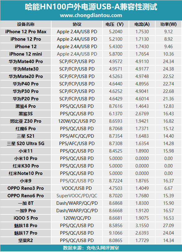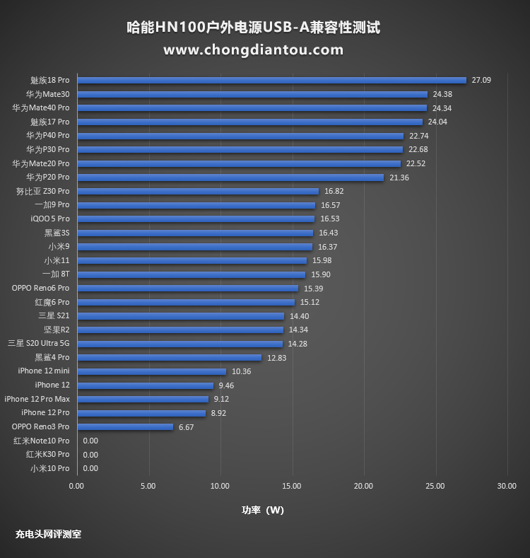 因为USB-A支持最高22.5W快充,为魅族18 Pro充电功率达到了27.09W,可见USB-A在功率的设计上还是预留了一定的功率余量的,其他大部分设备处于正常的快充状态。