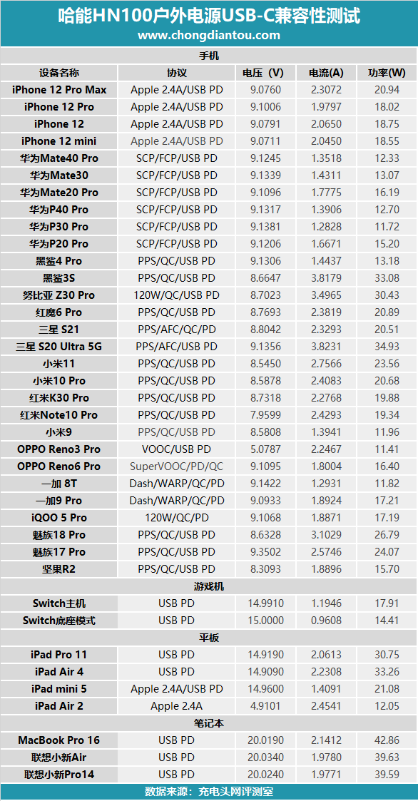 将USB-C全部的测试数据汇总,对于绝大部分设备均可以提供PD快充,可以为笔记本电脑快充。