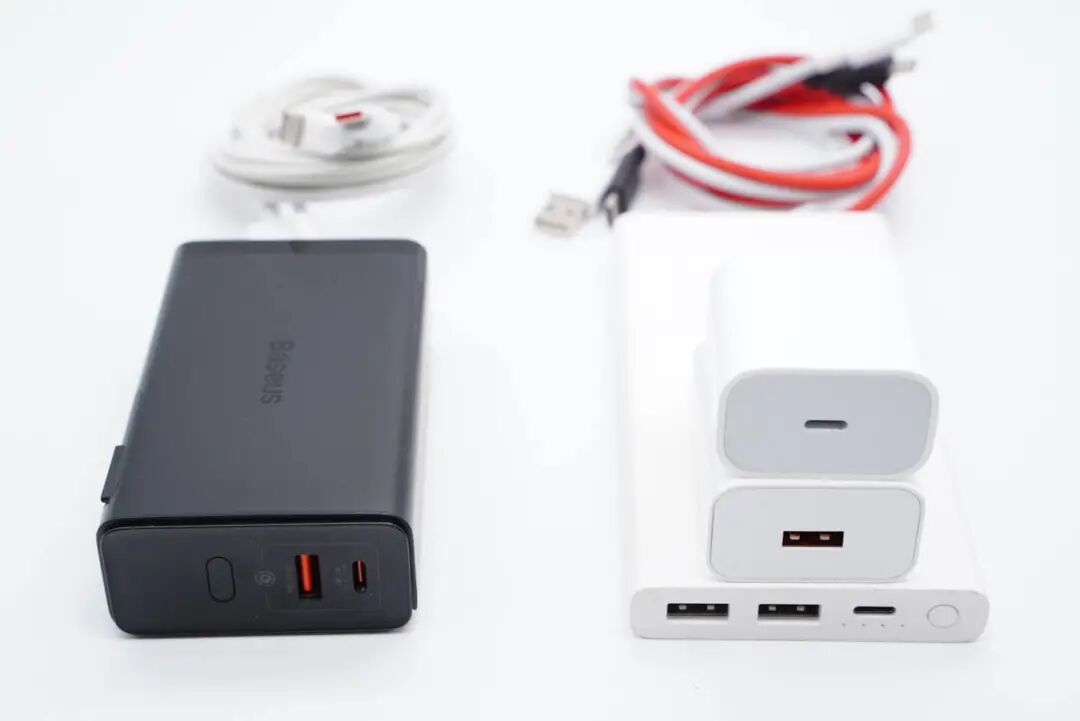 从前,需要1个充电宝,2个充电器和2条数据线。现在,只需要一个倍思87W能量堆和2条数据线。