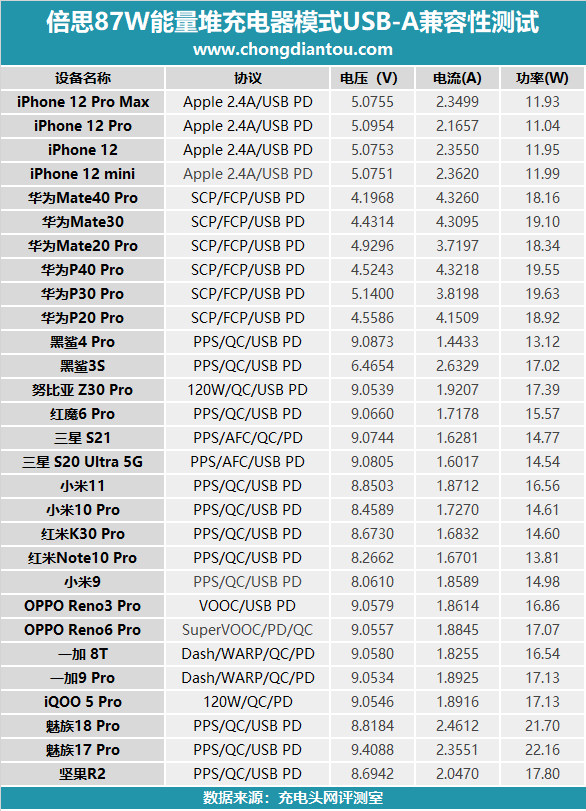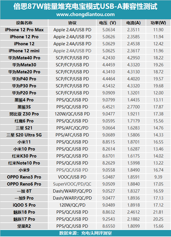 测试数据汇总,对于iPhone、笔记本和平板可以提供PD快充,手机这里也是几乎清一色的9V快充,部分机型可以握手PPS大功率充电。