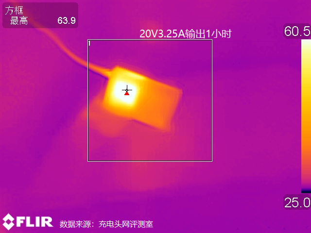 以65W的功率持续满载输出1小时后采集到壳体表面的最高温度为63.9℃。