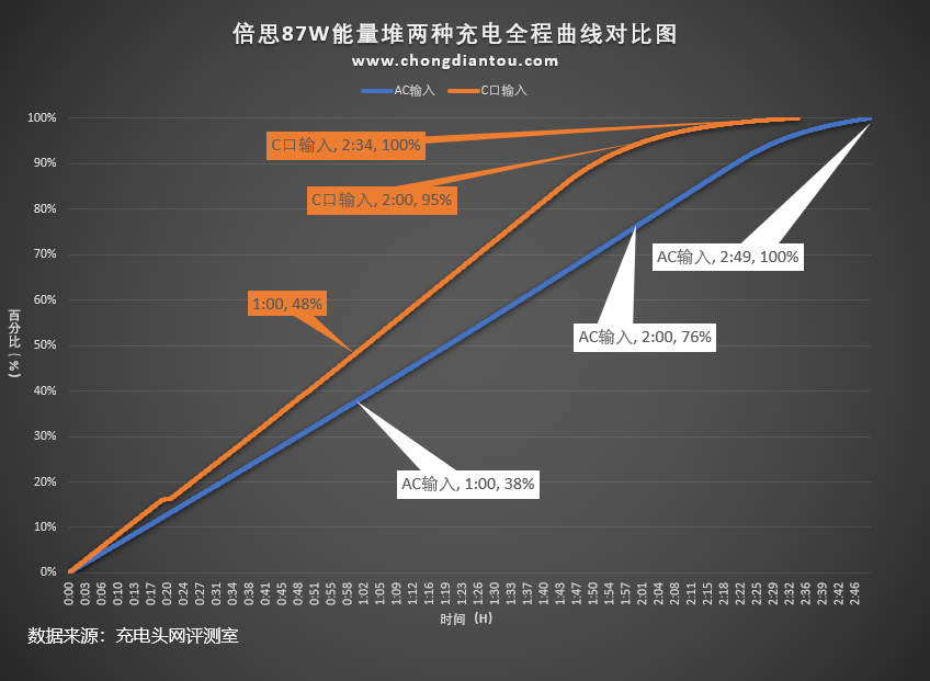 这里将AC输入和USB-C输入分别绘制成曲线图,可以看出整体来看还是USB-C输入要更快一些。