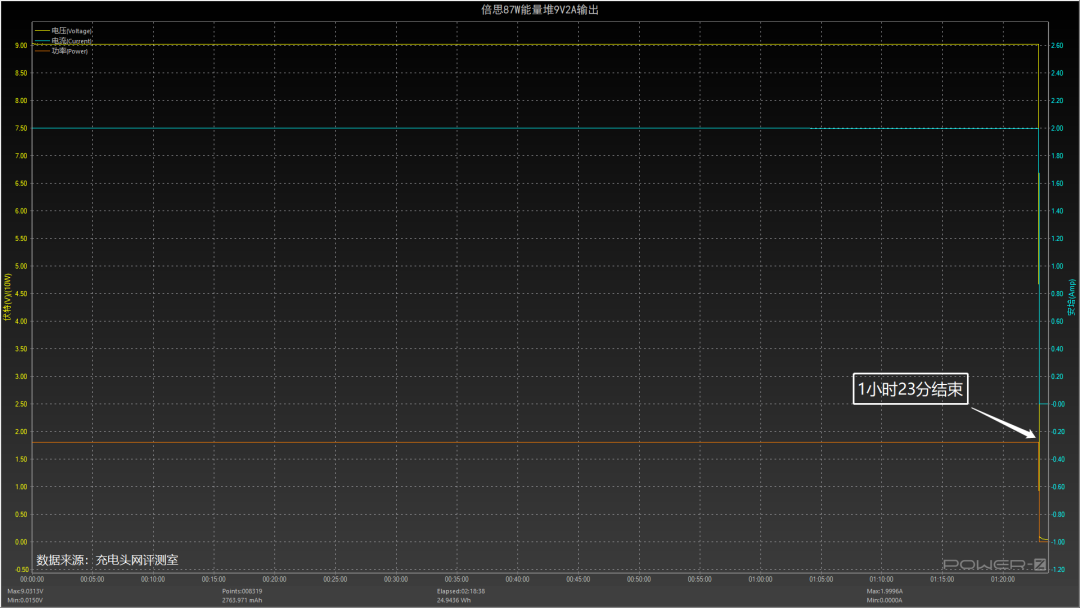 将电压提升至9V,让Baseus倍思87W能量堆以9V2A 18W的功率持续输出,全程耗时1小时23分。放出的能量约为24.9436Wh,效率约为24.9436/38.5=64.78% 。