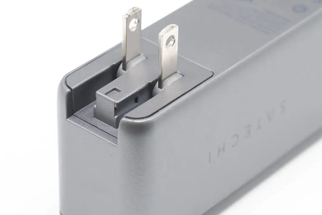 配备可折叠插脚,插脚类型为美规,通用国标插座。