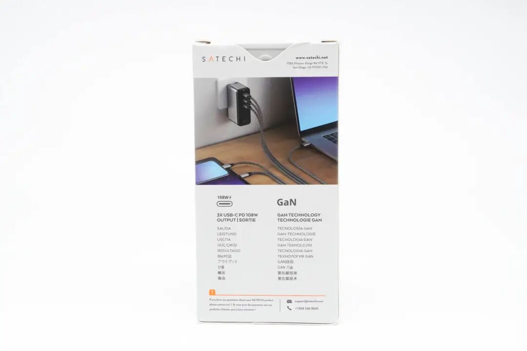 SATECHI 108W氮化镓充电器采用长条状的设计风格,外观以灰色为主,黑色为辅,正面印着SATECHI的品牌Logo。