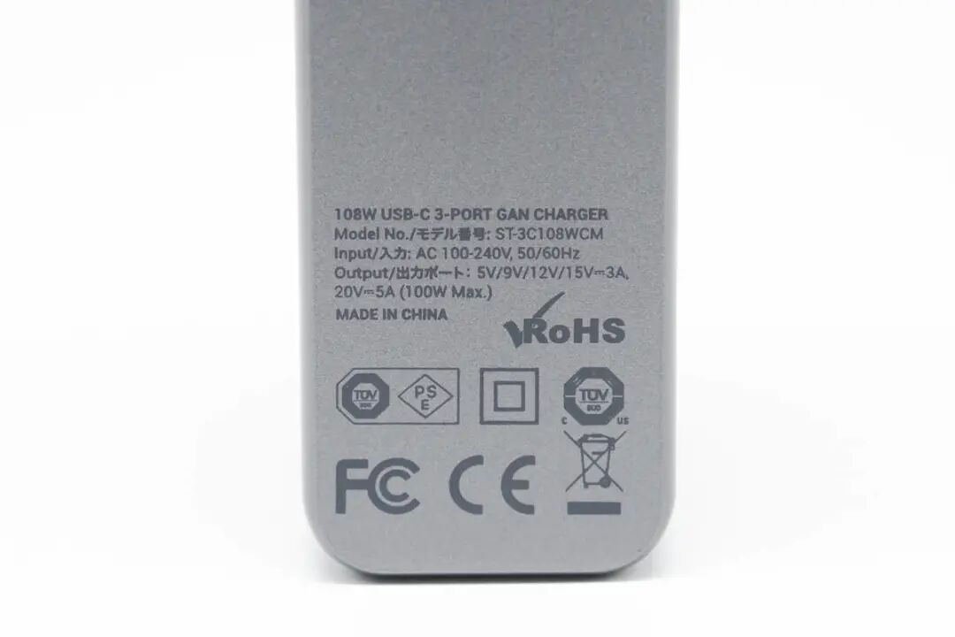 SATECHI 108W氮化镓充电器的具体型号为ST-3C108WCM,支持100-240V宽电压输入,中国制造。
