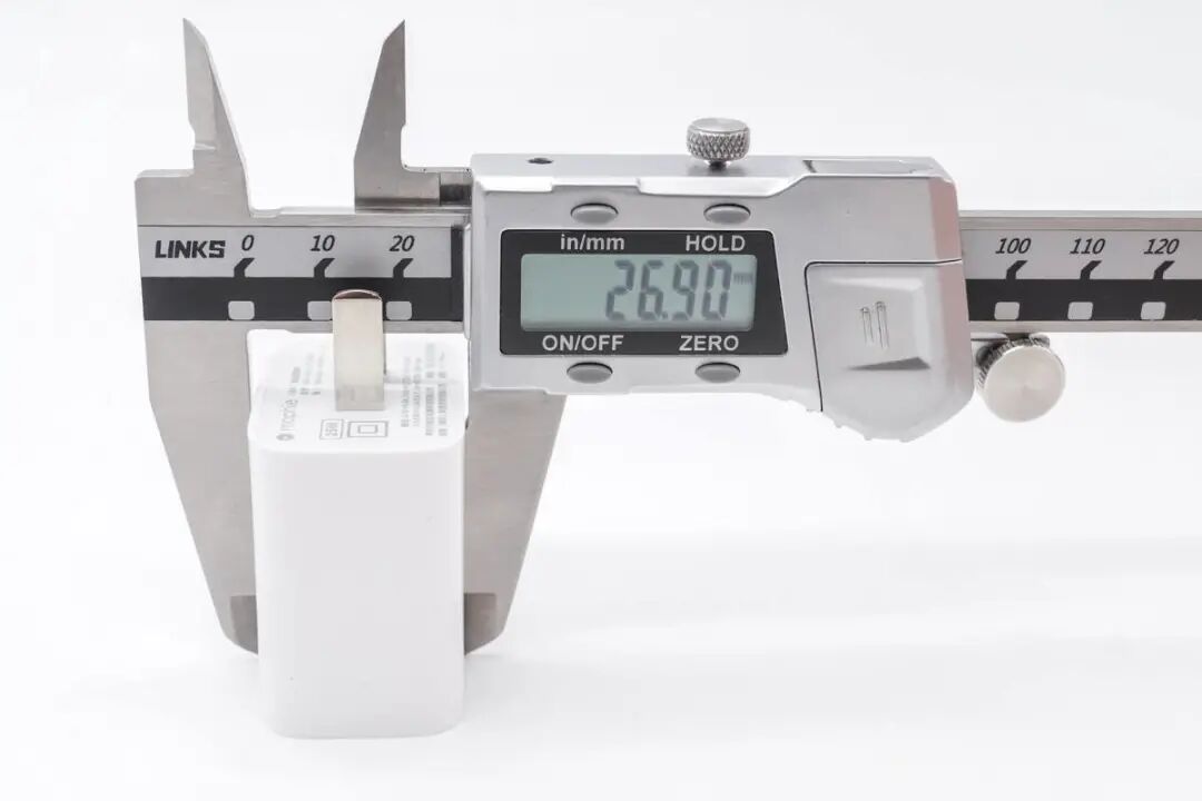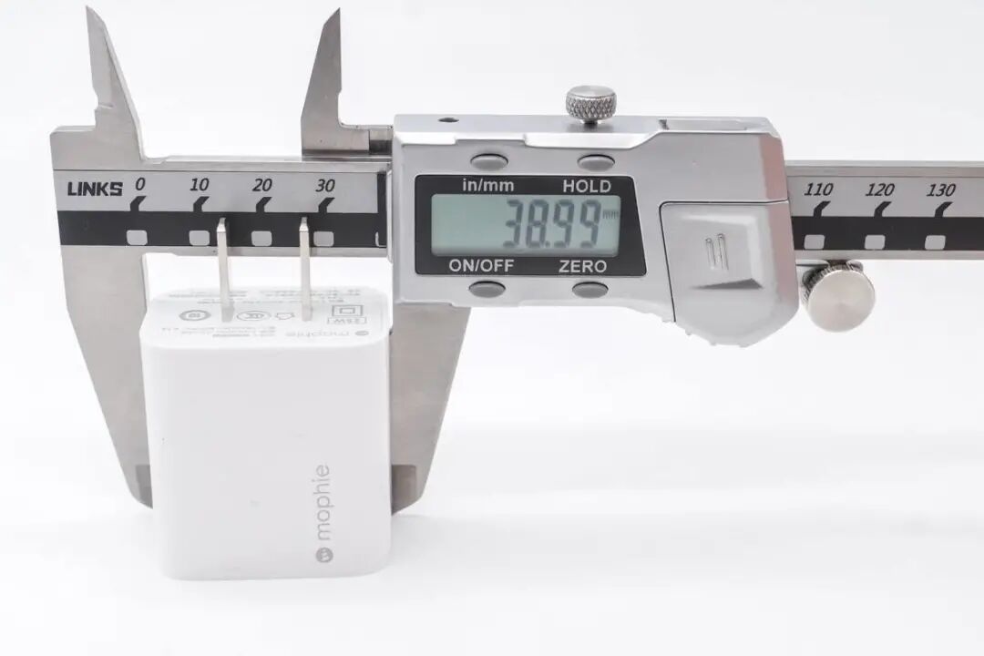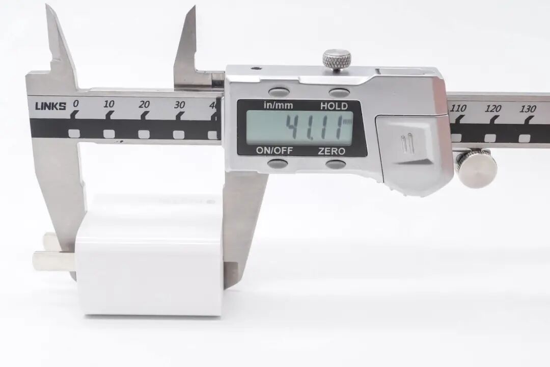 接下来测量 mophie 25W PD充电器的尺寸,充电器长度约为41.11mm。