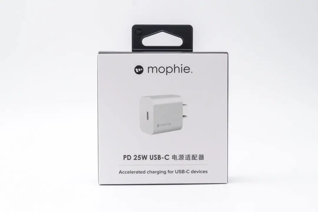 mophie 25W PD充电器外包装正面印刷充电器外观,延续了 mophie 充电器一贯的简洁外观。