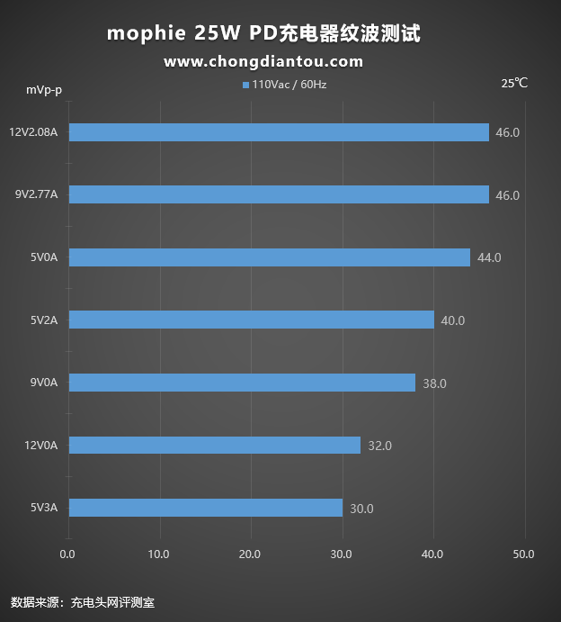 110V 60Hz下最高为中46mVp-p,充电器处于12V2.08A、9V2.77A输出;最低为30mVp-p充电器处于5V3A输出。