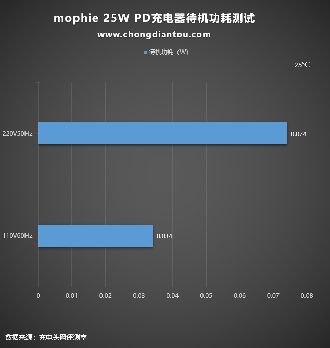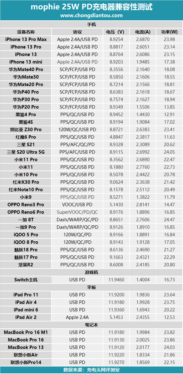 介绍完 mophie 25W PD充电器的外观尺寸,接下来就带大家看一看这款充电器的具体使用体验。充电头网会从协议测试、兼容性测试、充电全程测试、待机功耗测试等方面带大家全方位了解这款充电器。
