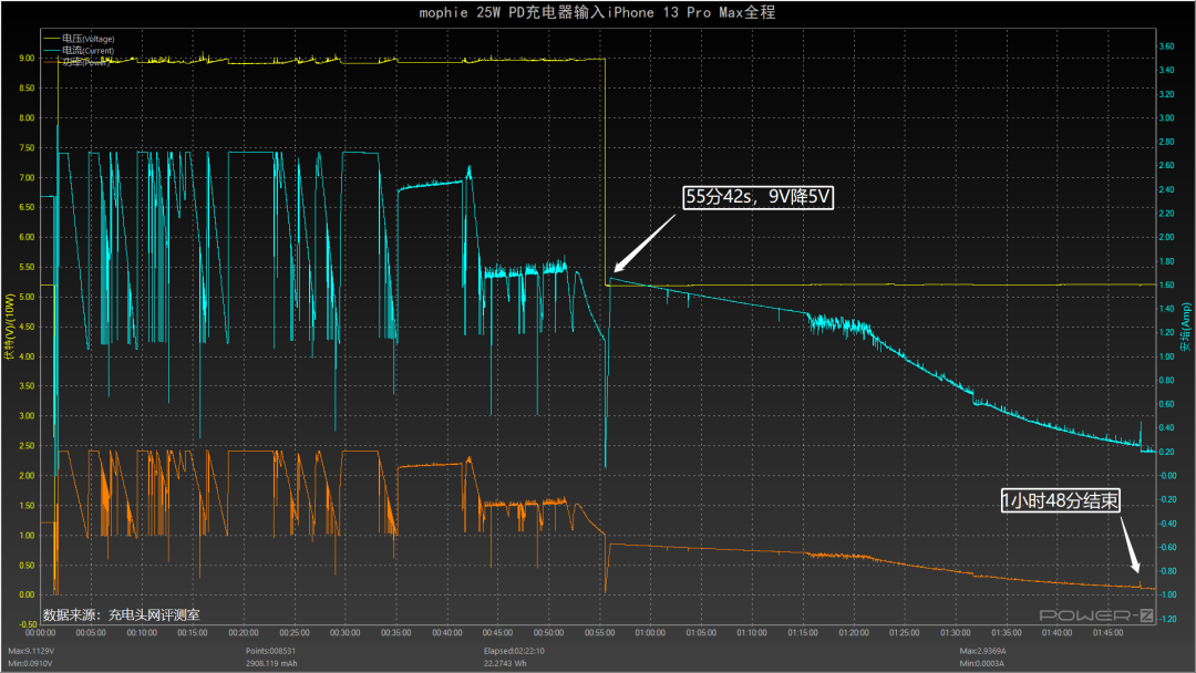 充电最高功率约为26W左右,55分42秒时,充电功率从9V降至5V,进入涓流充电模式,充电全程耗时1小时48分。