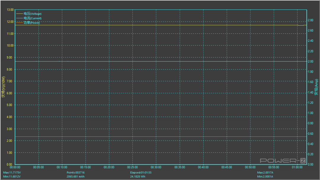 将充电器档位调至 12V 2A,以24W功率持续输出一小时,测试过程中电压、电流呈水平直线,无明显波动情况,长时间满载使用也相当稳定。
