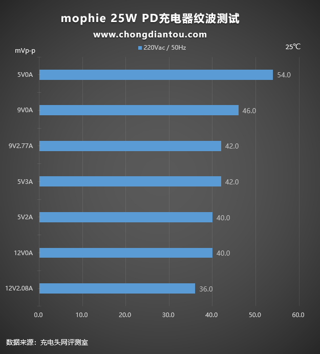 国家标准中充电器纹波要求是不高于200mVp-p,mophie 25W PD充电器在110V 60Hz、220V 50Hz输入电压下,所有输出功率纹波峰峰值均低于200mVp-p这个标准,表现不错。