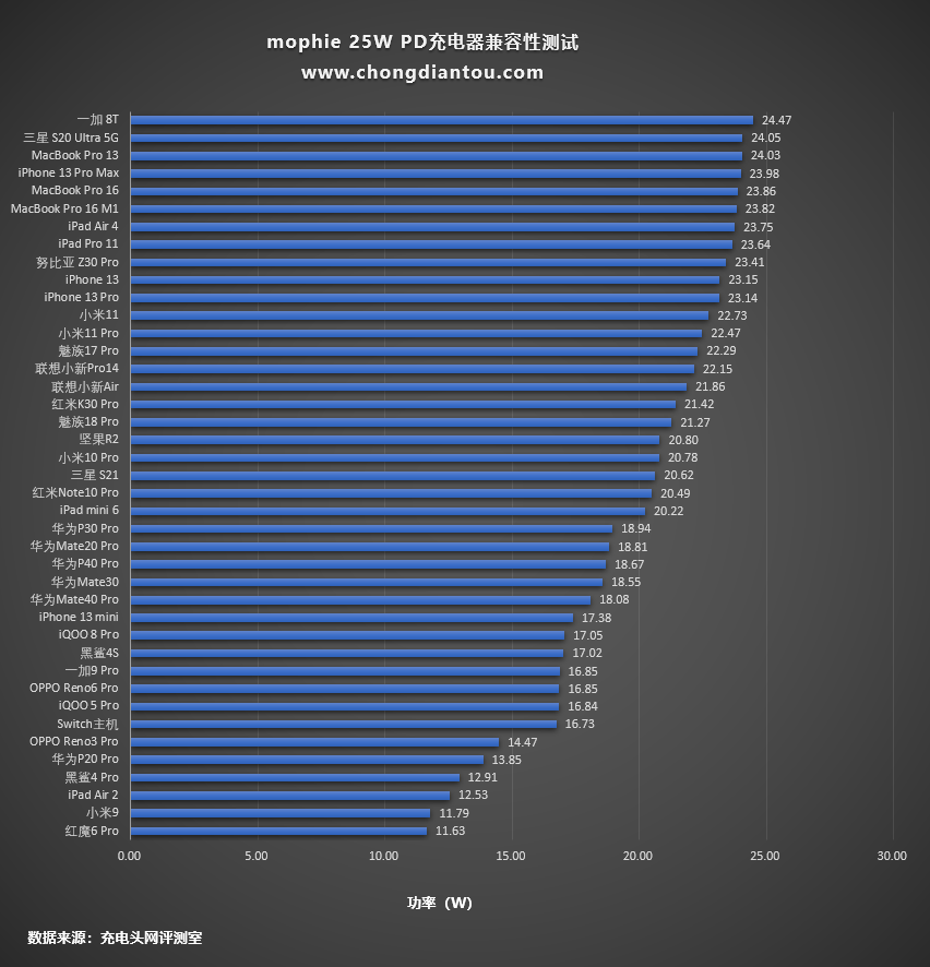 兼容性测试环节可以清楚的得知充电器为各个设备的充电情况,充电头网会使用数十款设备搭配充电器进行测试,为读者呈现真实的测试数据。