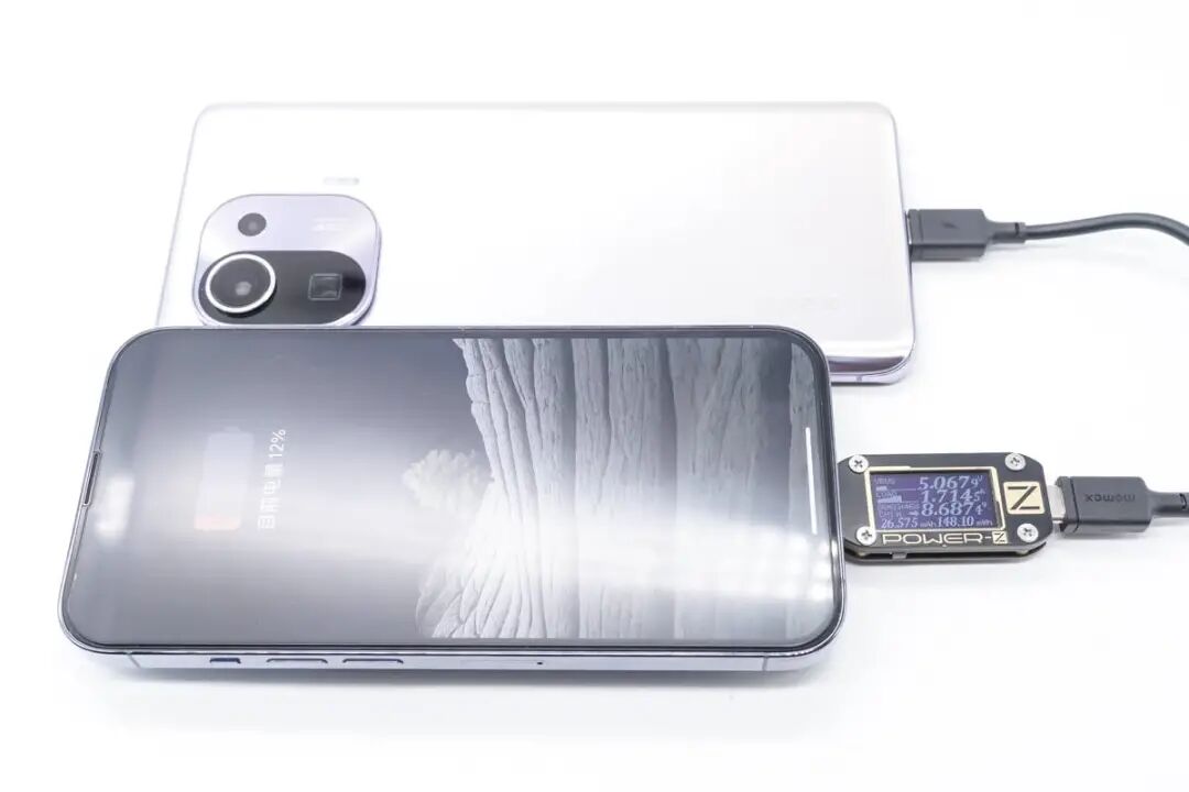 在为 iPhone 13 Pro 磁吸无线充电的同时,可以为小米11 Pro 提供8.68W的有线充电功率,充电无需排队。