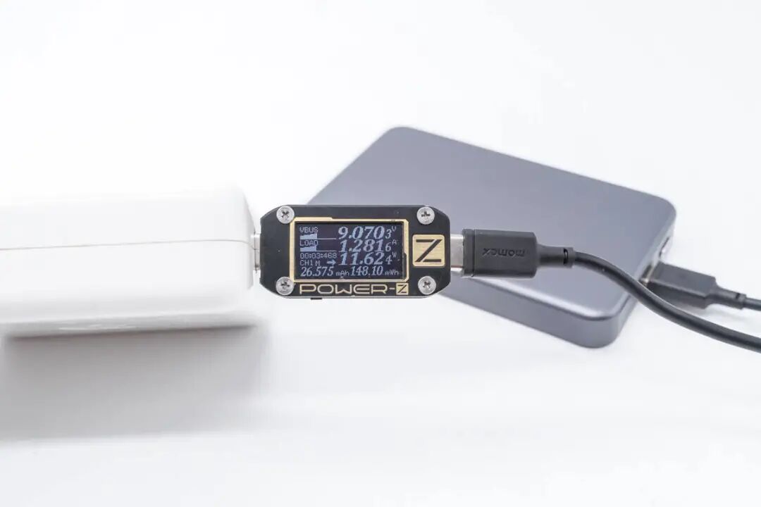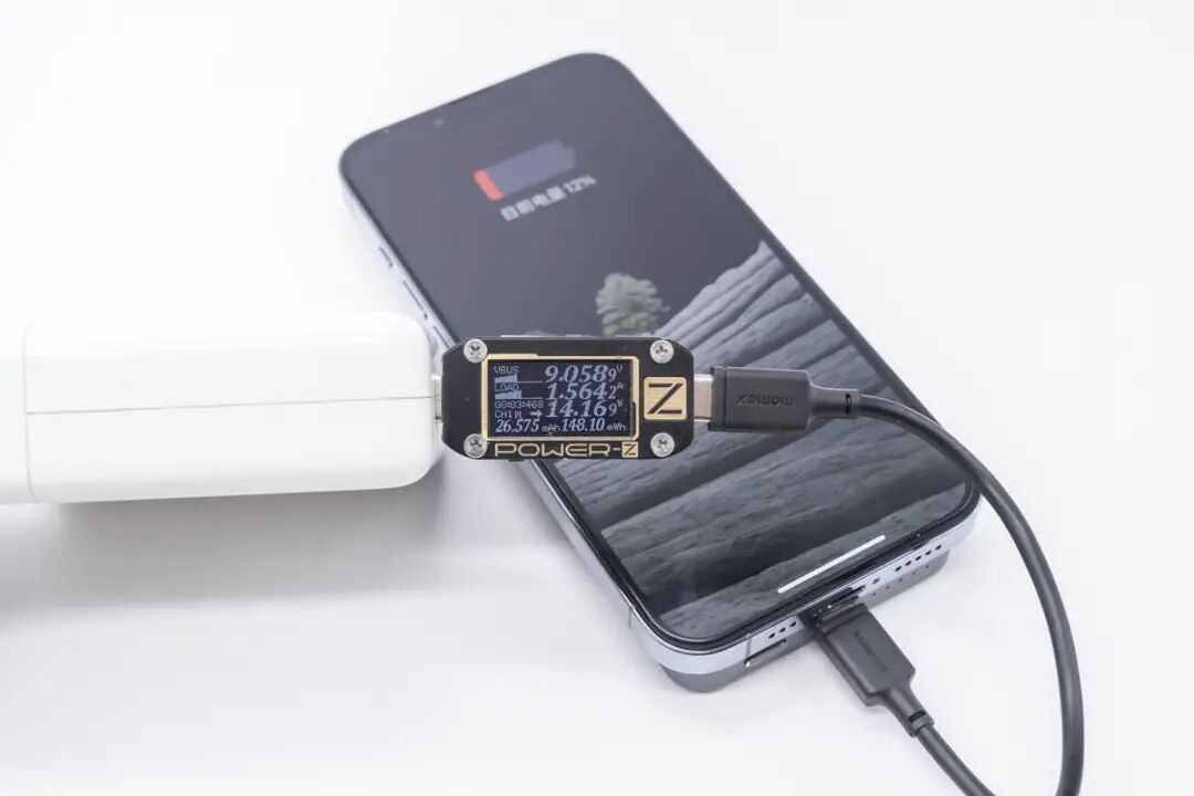 为手机充电快可不够,自充还要快,这里使用充电器对 MOMAX 磁吸无线充电宝充电,记录全程的功率变化。