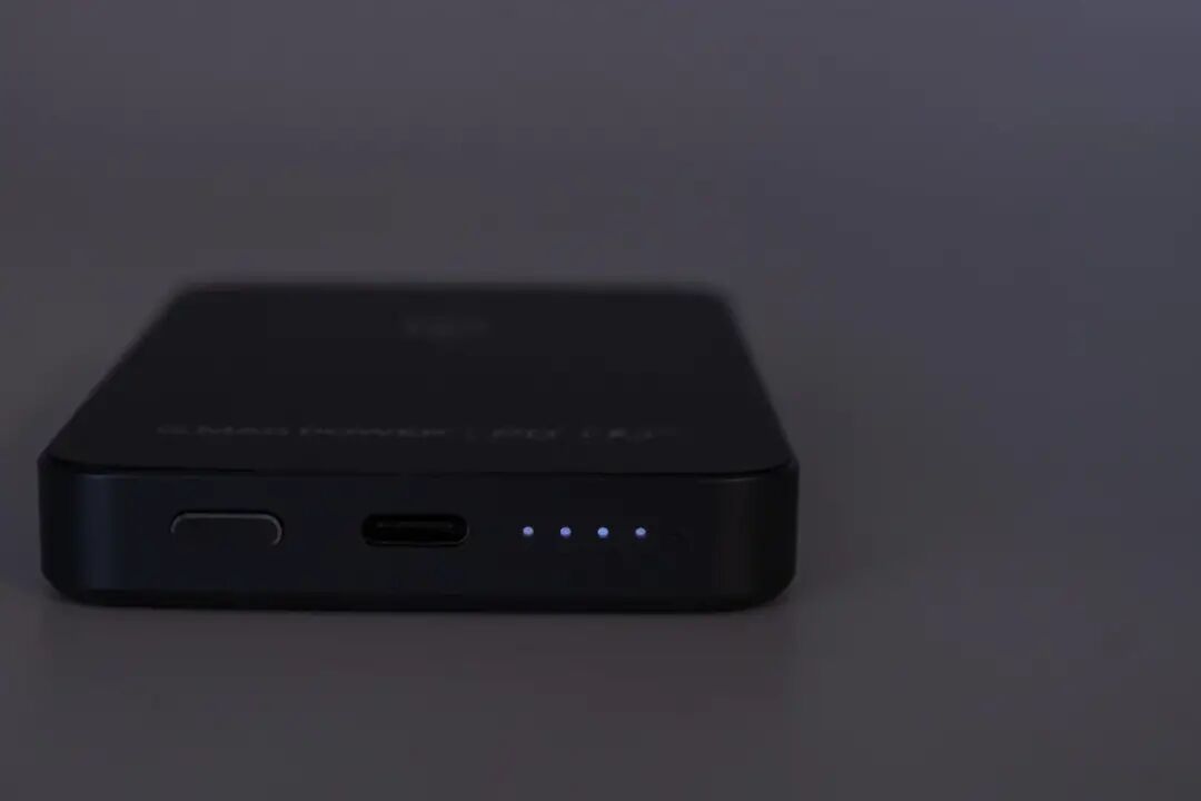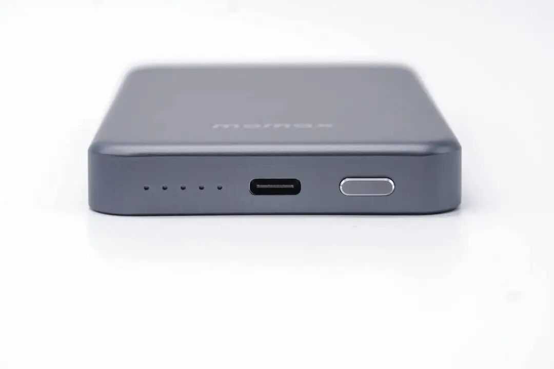MOMAX 磁吸无线充电宝底部为 USB-C 双向充电接口、电源键和五颗LED电量指示灯。