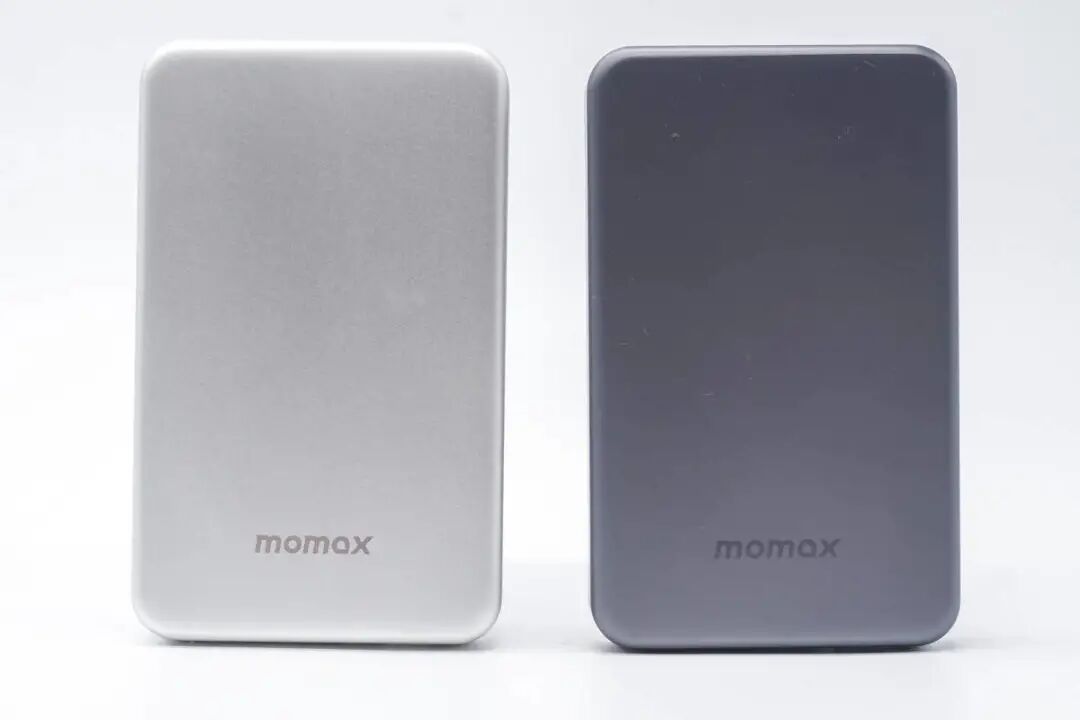 MOMAX 磁吸无线充电宝有深空灰和银色两种颜色,外包装印刷产品外观。