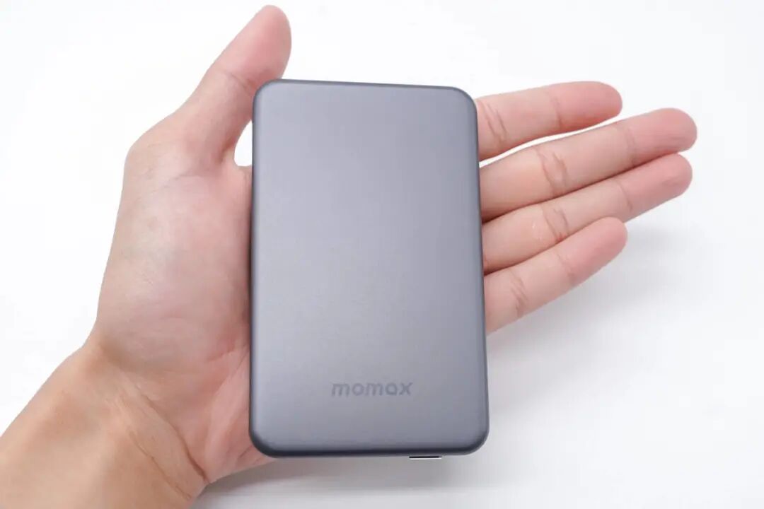 握在手里,MOMAX 磁吸无线充电宝的大小还算合适。
