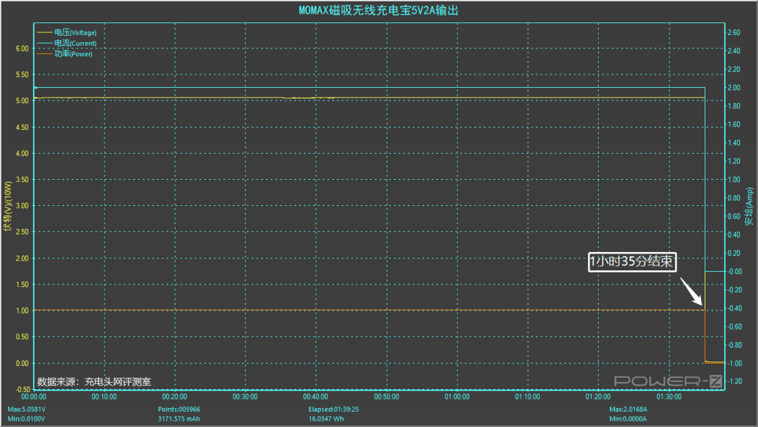 输出效率则是反映充电宝实际输出电量的标准,使用负载连接 MOMAX 磁吸无线充电宝,设定功率让充电宝放电,测量实际放出的电量。