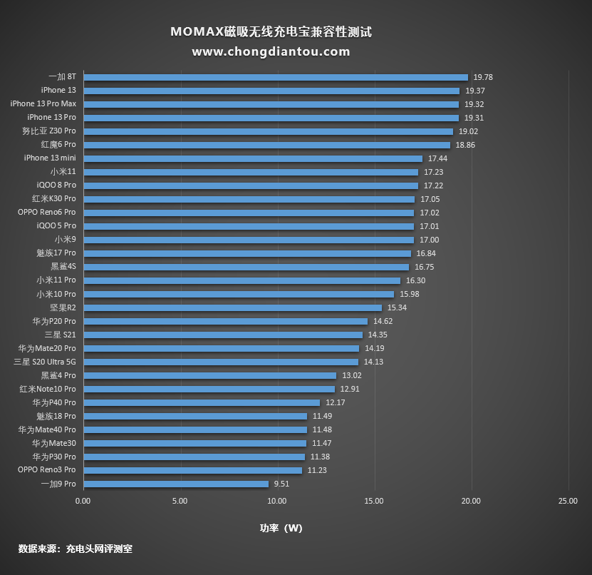 兼容性测试环节可以清楚的得知 MOMAX 磁吸无线充电宝为各个设备的充电情况,充电头网会使用数十款设备搭配充电宝进行测试,为读者呈现真实的测试数据。