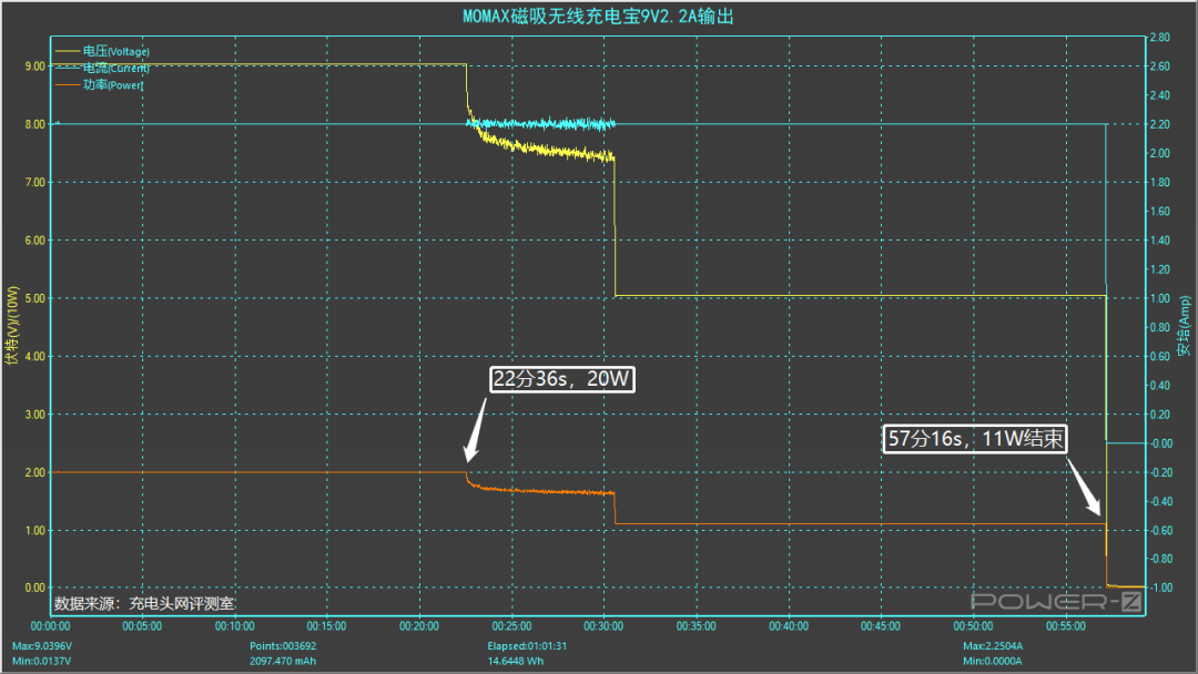 MOMAX 磁吸无线充电宝充电最大功率约为16W,持续1小时6分,随后进入涓流充电模式,全程耗时1小时40分。