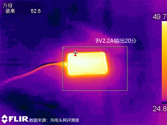 将充电宝输出档位调至9V2.2A,在20W功率输出20分钟,充电宝正面最高温度约为52.5℃,在正常温度范围。