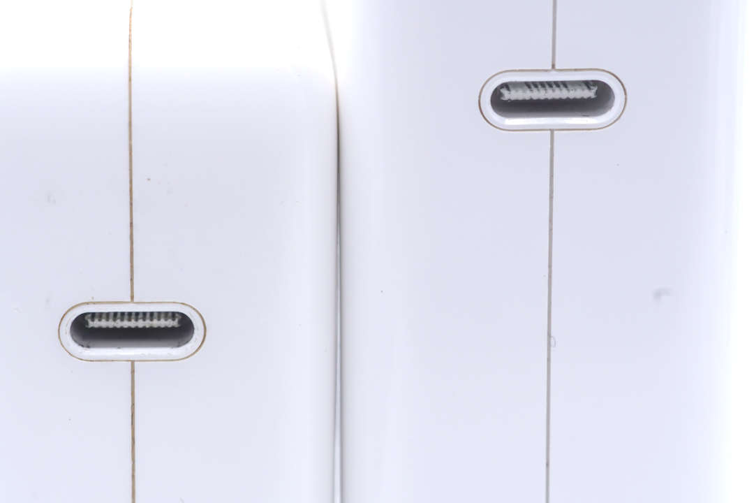 苹果140W与苹果96W输出接口,均与苹果其他原厂充电器一样,采用了相同的单USB-C输出口配置。接口外沿为塑胶材质,白色胶芯内舌。