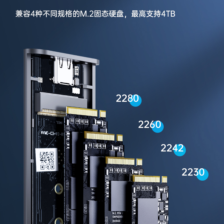 单盘位硬盘盒内置一个 M.2 插槽,兼容 2280 / 2260 / 2242 / 2230 四种常见的长度规格,最高支持单条 4TB 容量。双盘位则是左右两边单独的槽位,同样支持四种长度规格。