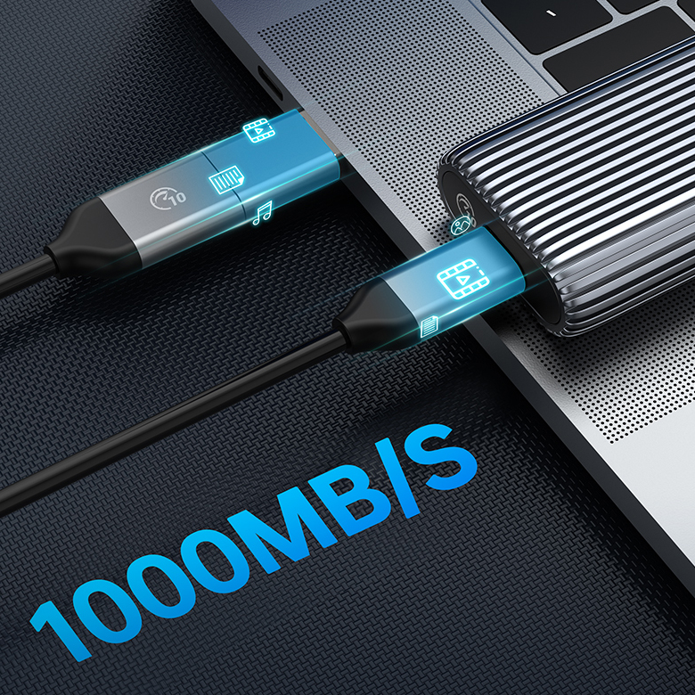 NVMe 款硬盘盒配套线缆为二合一数据线,通过插拔头部转接头实现 USB-A to USB-C、USB-C to USB-C 之间变换,传输规格为 USB3.2 Gen2 10Gbps,灵活应对不同设备使用需求。