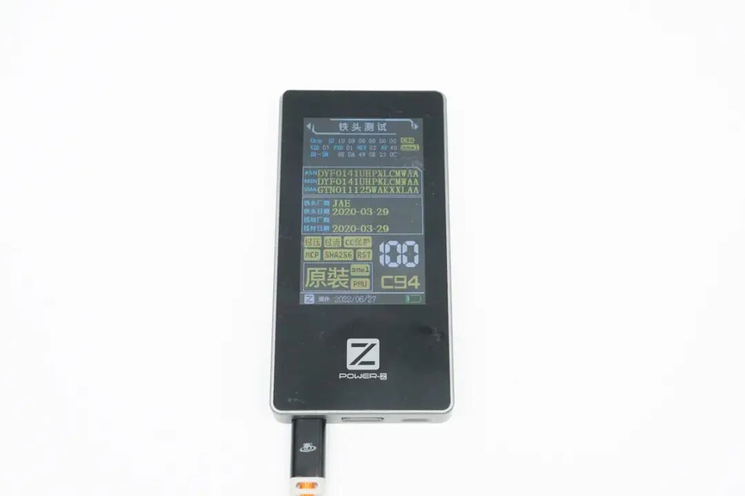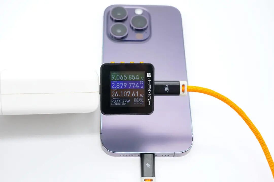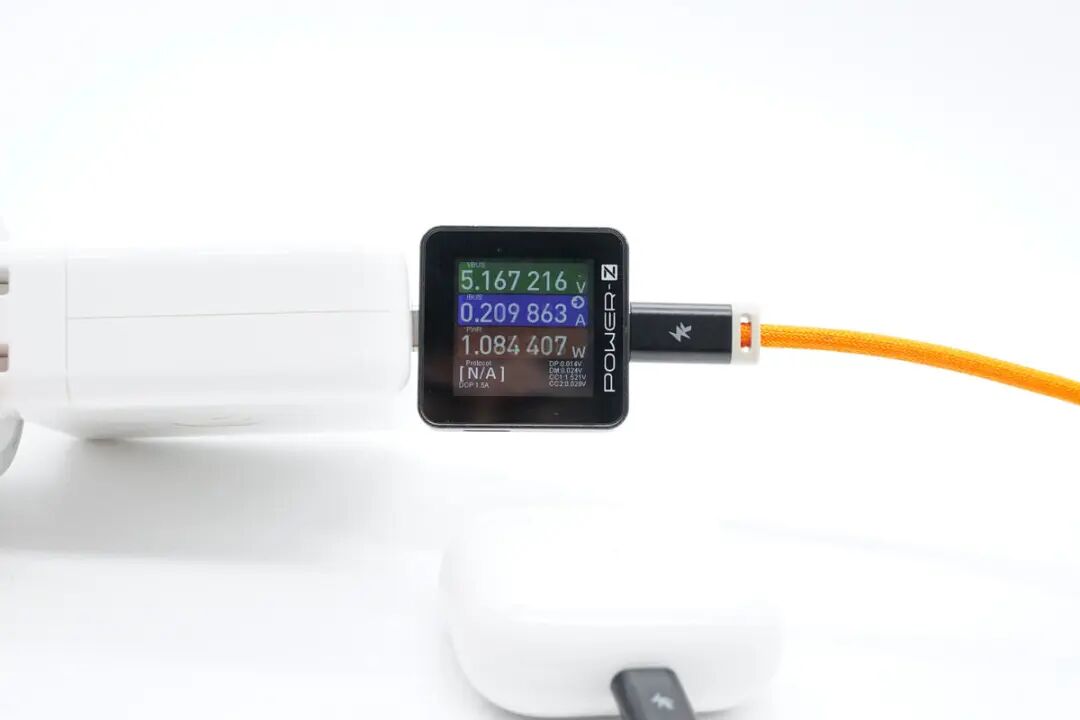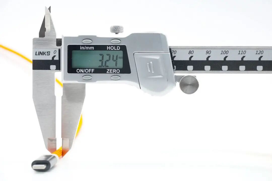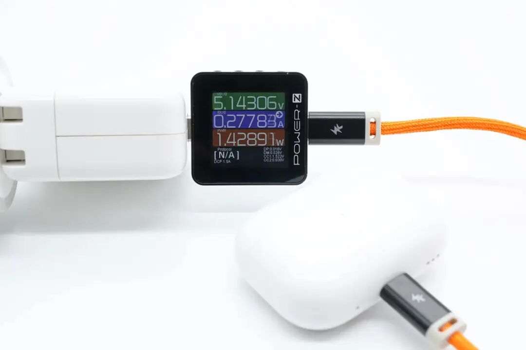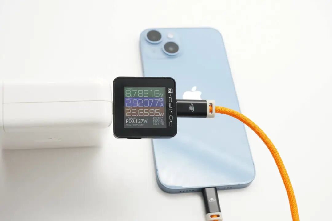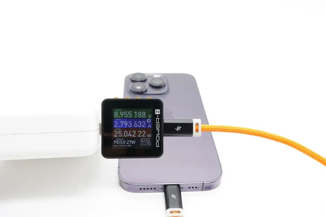 思路清晰,先看产品。PANDAER C to Lightning充电线材依旧为亮橙色PVC高密度编织线身设计,硬度方面与上款C to C线材一致,属于刚柔并济类型;整体线身抗脏耐用防缠绕,平整不易起毛刺。编织线身和子端接头延续全新抗折霓彩拖尾设计,镂空衔接处可见模内注塑处理贴合;端子头壳体采用灰白PVC外壳+黑色哑光磨砂壳设计,哑光磨砂壳部分丝印魅族PANDAER 品牌奇趣图腾Logo,端子头壳体长度设计相比普通C to Lightning线缆更长一些。PANDAER C to Lightning充电线材子端USB-C端口内部针脚为特殊定制,无需担心公母座接口物理兼容性问题,支持正反盲插设计。PANDAER C to Lightning充电线材子端 Lightning 采用全新C94端头,拥有更好的阻尼感及耐磨耐刮特性。PANDAER C to Lightning充电线材子端头与iPhone 原装充电线对比,Lightning 子端除两侧卡口设计有些许区别外,针脚、合金材质与白色绝缘区域等方面在观感上并无差距。使用POWER-Z MF001测试这条C to Lightning充电线,线材最终评分是100分,端子为C94,同时也验证此款线材通过苹果MFi认证,与官方宣称一致。PANDAER C to Lightning充电线材长度实测约为122cm,可满足日常使用下的长度需求。PANDAER C to Lightning充电线材线身直径实测约为3.24mm。