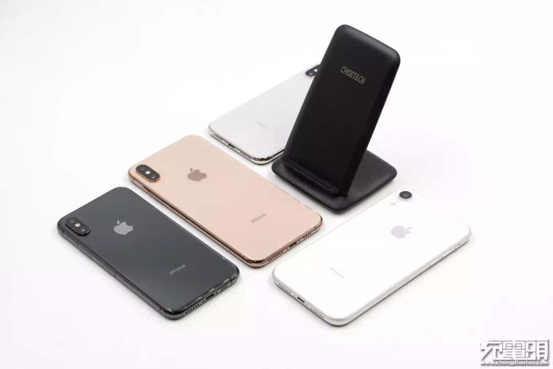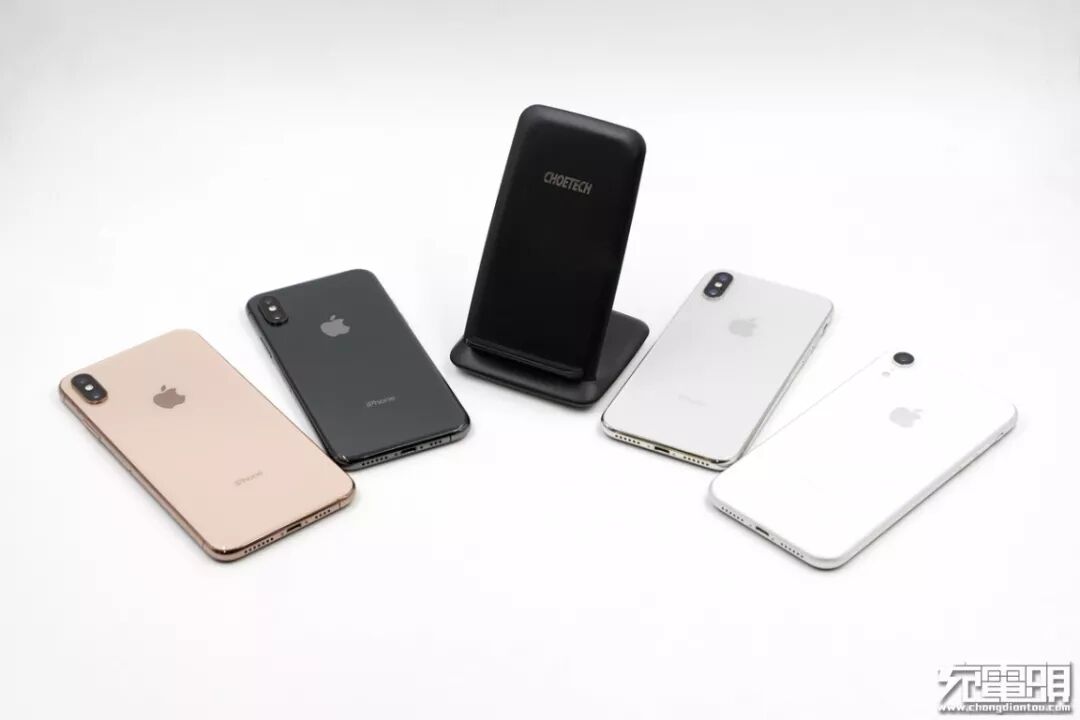 从左到右分别是深空灰的iPhone XS、金色的iPhone XS Max、CHOETECH迪奥科立式快速无线充电器、白色的iPhone XR、银色的iPhone X。