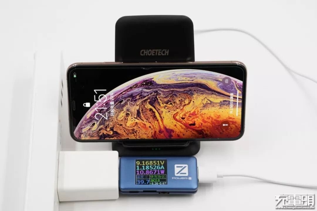 iPhone XS横竖摆放都可以充电,采用ChargerLAB POWER-Z FL001S对输入端进行监测,输入功率10W左右,经过功率换算,处于APPLE 7.5W无线快充模式。