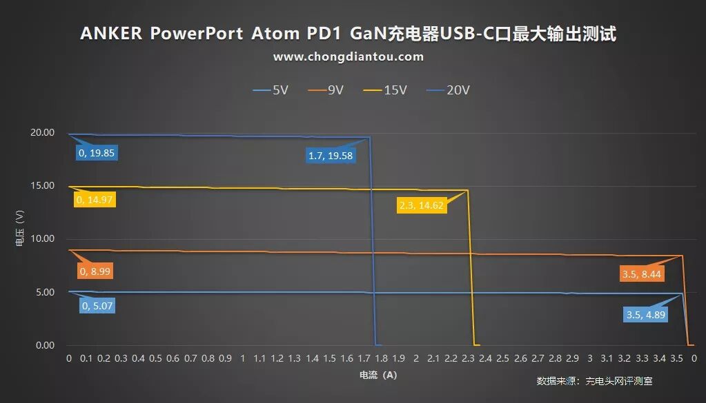 5V档位输出下,最大输出4.89V/3.5A/17.11W;9V档位输出下,最大输出8.44V/3.5A/29.54W;15V档位输出下,最大输出14.62V/2.3A/33.62W;20V输出档位下,最大输出19.58V/1.7A/33.28W。各档位实际最大输出要比标称值都大,预留了2~3W余量。