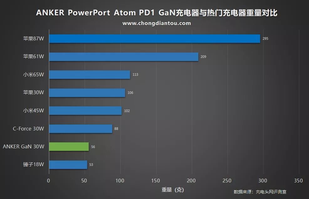 与市面上热门的PD充电器重量对比,ANKER这款充电器比苹果30W充电器轻32g,与锤子18W PD充电器差不多重。