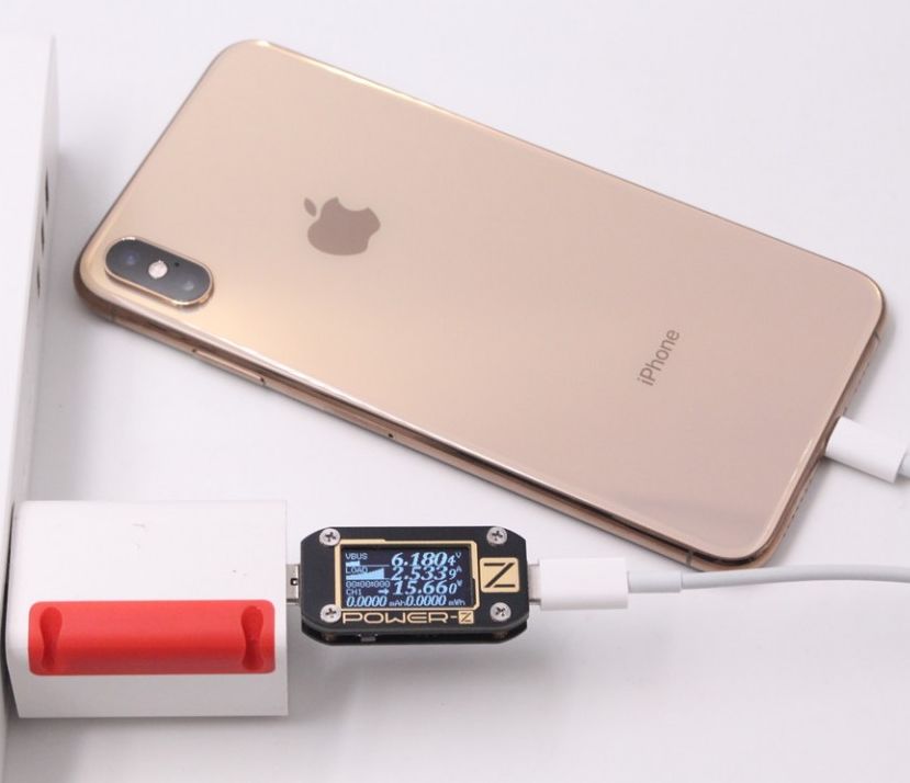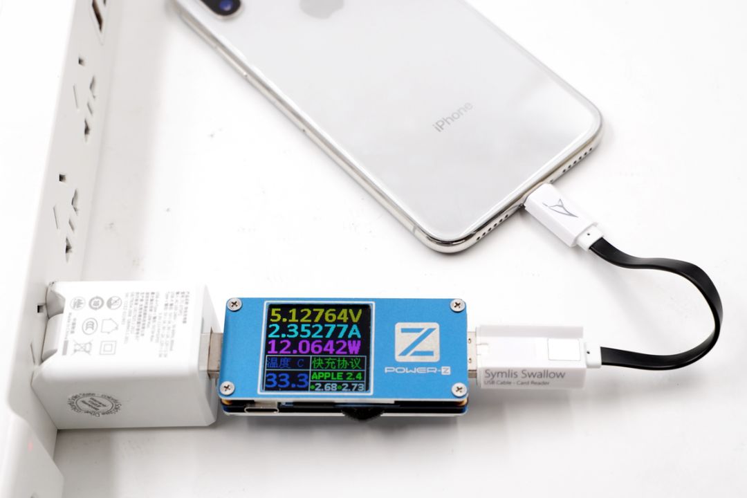 给支持iPhone XS Max充电,显示电压9.19V,电流1.82A,功率约为16.76W,支持USB PD快充。对于以上四款iPhone X,充电器均为9V高压快充模式。