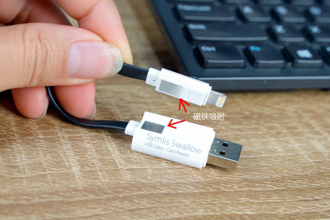 symlis swallow苹果数据线,十分有特色的MFI认证苹果线,认证头为C48,实测充iPhone X能握手APPLE2.4A,功率能跑满12W。USB口带TF读卡器功能,有趣的是头和小头吸在一起时可以在电脑读取卡中数据。PS:数据读取功能只在USB-A接口上可以使用,Lightning接口无法读取TF卡数据。
