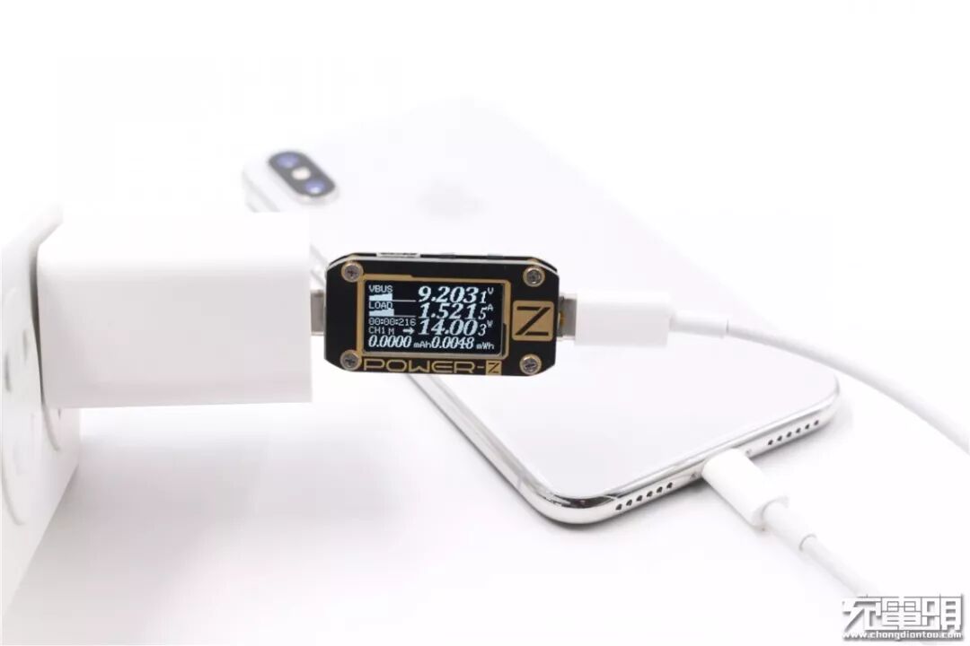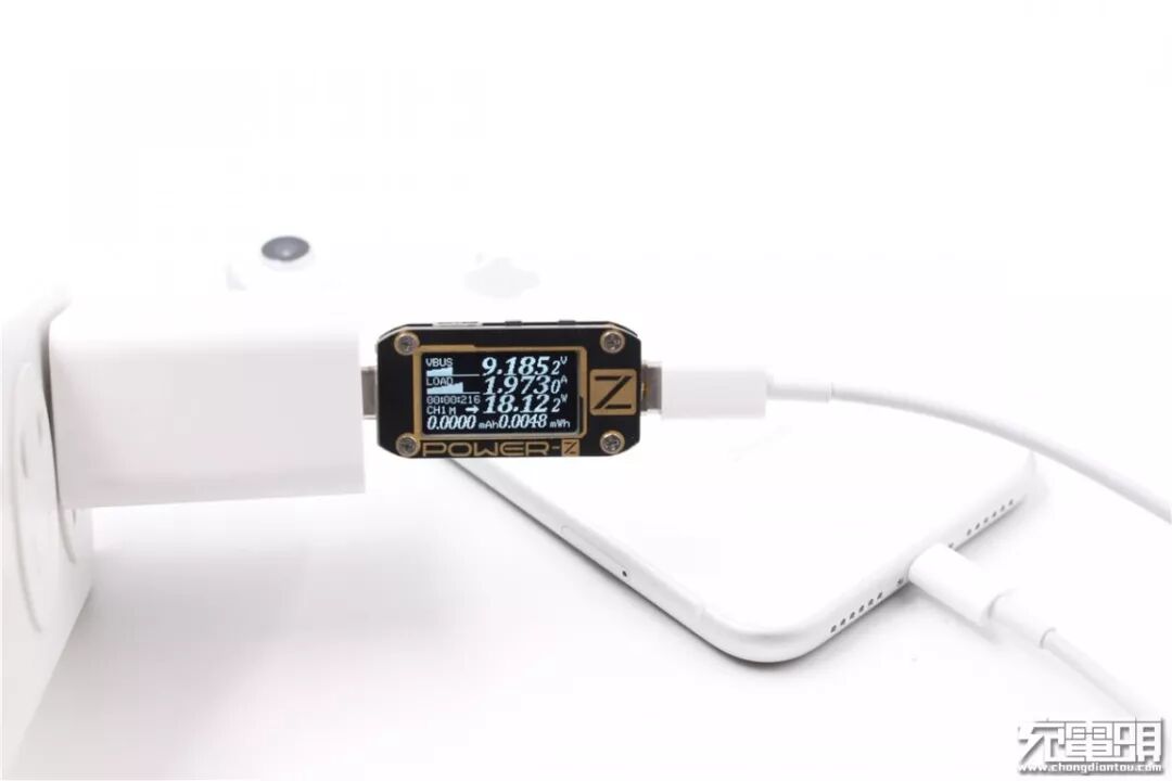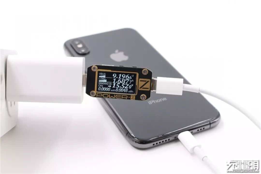 给支持iPhone XS Max充电,显示电压9.19V,电流1.82A,功率约为16.76W,支持USB PD快充。对于以上四款iPhone X,充电器均为9V高压快充模式。