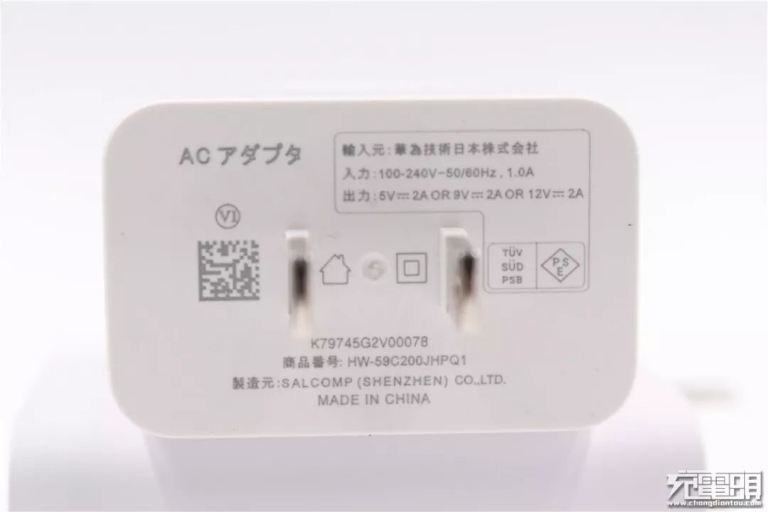 充电器由赛尔康技术(深圳)有限公司生产,产品型号:HW-59C200JHPQ1,输入支持100-240V 50/60Hz 1A;输出支持5V/2A、9V/2A、12V/2A。产品已经通过了VI(六)级能效以及PSE认证。