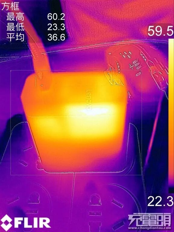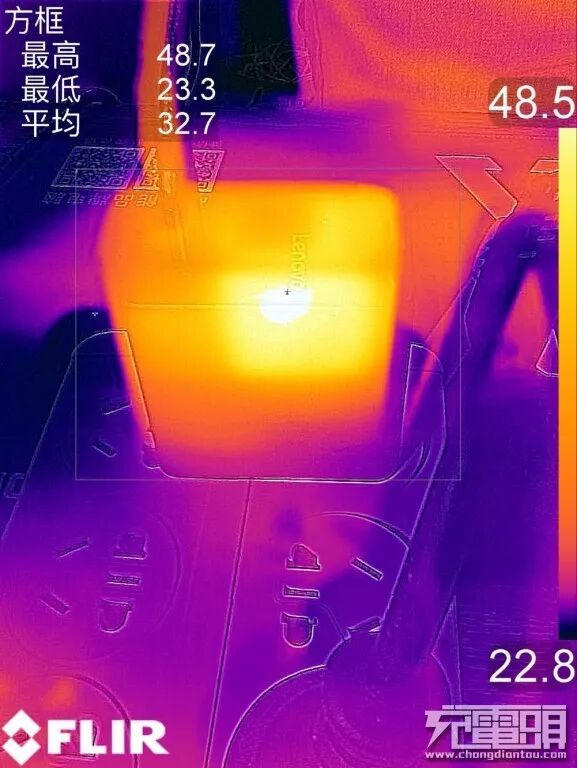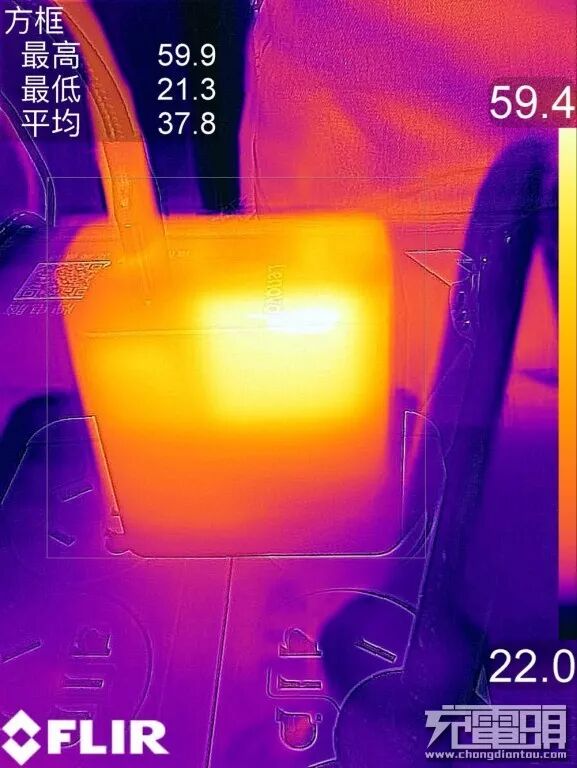 发热方面,使用诱骗仪对充电器进行档位诱骗,室内温度28℃左右,根据充电器当前档位的标称功率,持续满载15分钟。对于每个输出档位发热的情况,利用了FLIR温度测试仪测得温度: