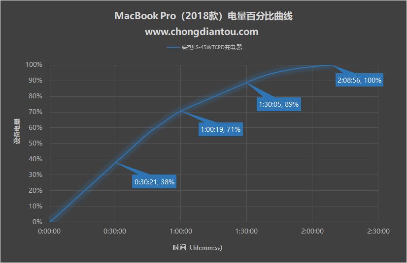 兼容性、最大输出、温度控制、效率转化测试做完了,但是在实际的使用当中表现会如何呢?为此,小编分别用联想LS-45WTCPD充电器对MacBook Pro 13寸 2018款和iPhone X进行了0-100%充电测试。