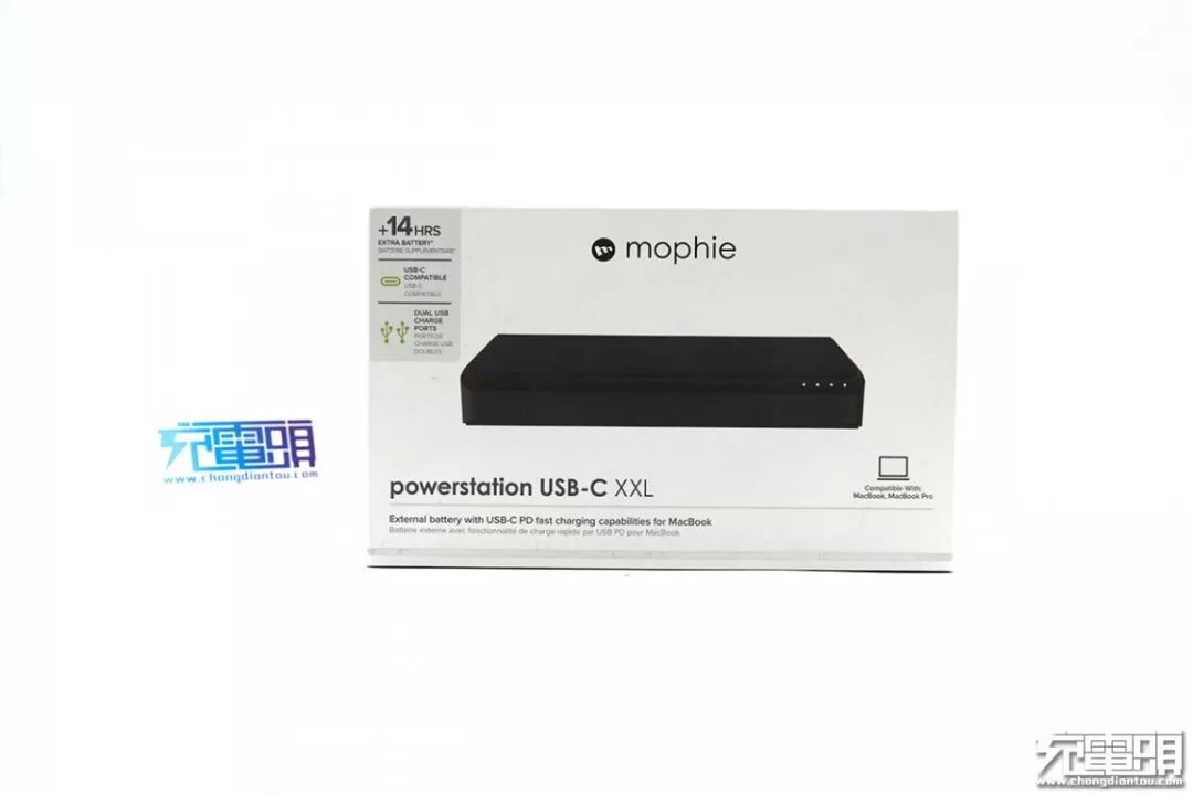 正面印有产品实图、产品名称以及mophie品牌标识。另外印有兼容MacBook、MacBook Pro的字样,和具备USB PD快充的说明。