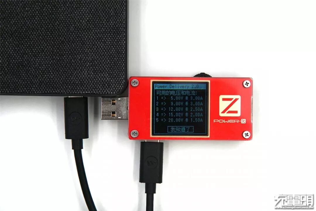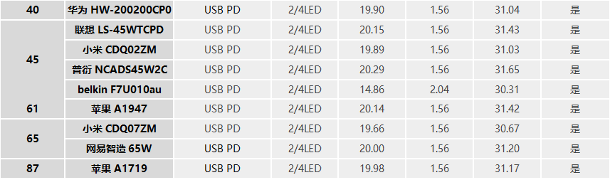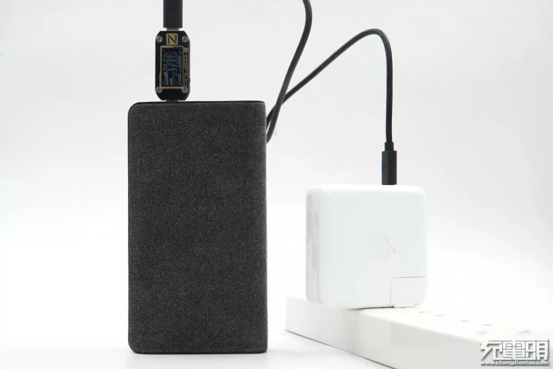 使用苹果61W充电器(A1947)充移动电源,功率可达31.55W,握手20V档位的USB PD协议。