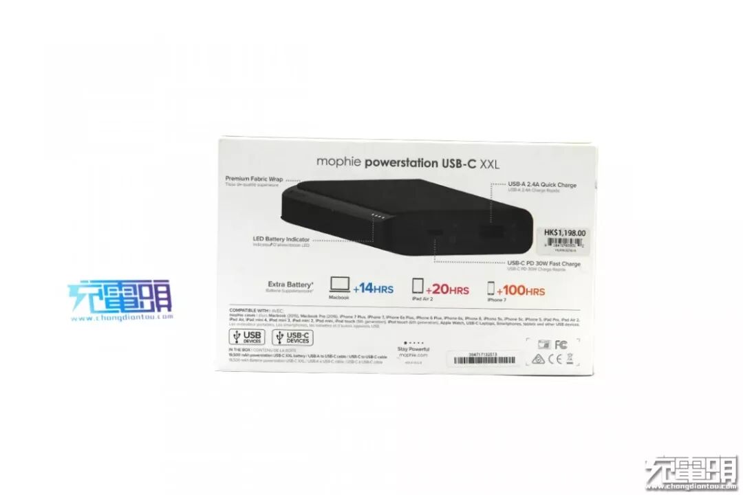 背面主要详细的说明了产品的特点、按键、接口等情况。从产品图中可以看出,移动电源有两个输出接口。一个是USB Type-C,一个是USB-A。官方宣传称,这款移动电源可为MacBook增加14小时的续航,为iPad Air2增加20小时的续航,为iPhone增加100小时续航。另外,我们手上这台的价格为1198港币。