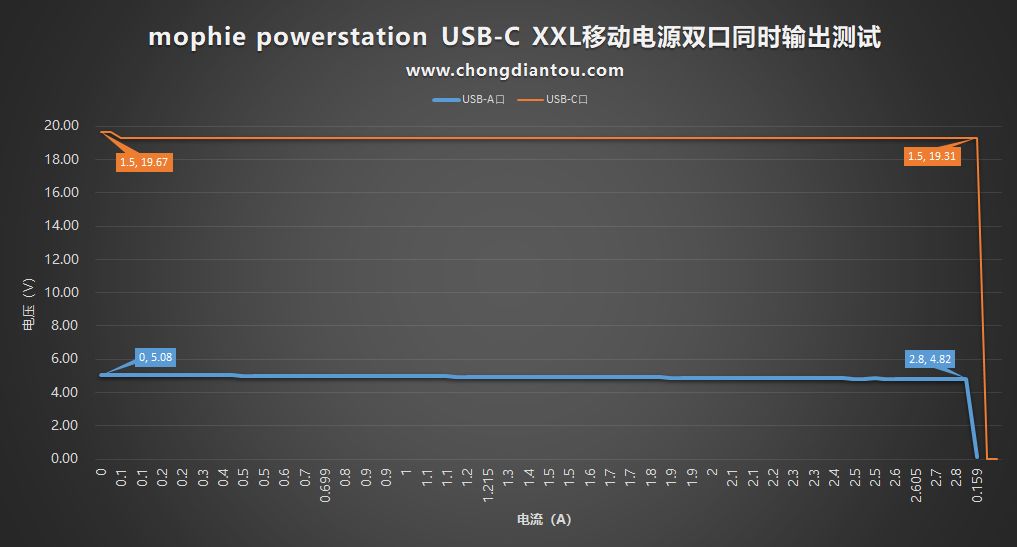 两个输出口同时输出的话,最高能输出多少呢?首先把USB-C进行诱骗在20V档位进行输出,在让USB-A的输出电流从0A逐渐递增,每次递增0.1A。从图表中可以看出,USB-A口的最大输出功率为13.49W(4.82V/2.8A),USB-C口的最大功率为28.96(19.31V/1.5A)。所以它的两个输出接口同时输出时,最高可达42.49W。